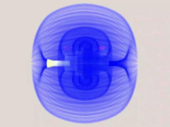 Here we show the magnetic field as a cloud. Where the cloud is denser, the field is stronger. This really gives the best representation of how the magnetic field tapers off.