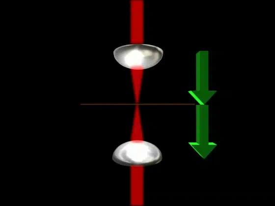 We trace out two incoming light rays showing how the first pass through the lens bends them in to cross the focal point.