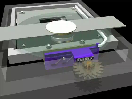 Finally, we add the mechanism that drives the optical read/write head in and out along the disk’s radius.