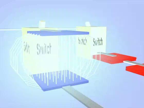 When the second switch is thrown the cell produces a potential difference across both the red capacitors.