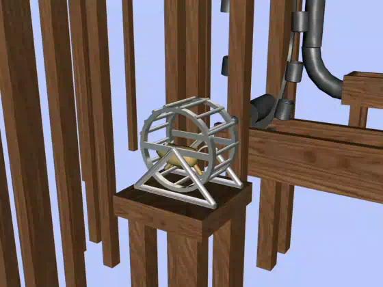 The first gerbil powers the first waterwheel bucket pump. She raises the water to a small reservoir increasing its potential energy.
