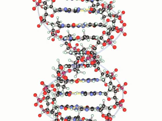 Here we see long segment of DNA with ten hydrogen bonded base pairs at its core, enclosed by the sugar phosphate spiral backbones.