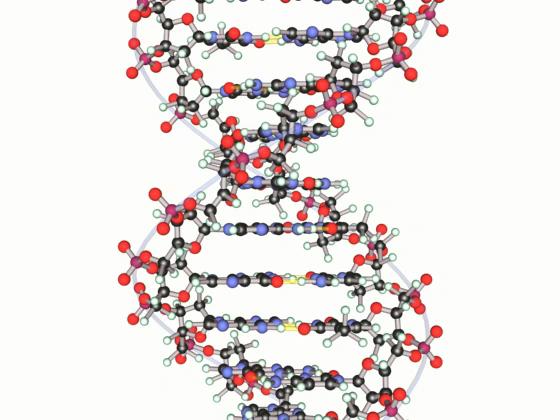 This model uses chemists’ standard color coding for atoms: Carbon = black; Hydrogen = white; Oxygen = red; Nitrogen = blue. We also use purple to represent phosphorus (a color chemists use to represent a variety of atoms).