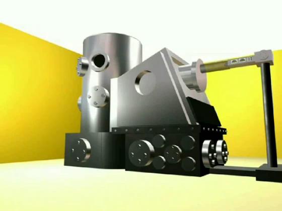 Here we make the walls of the vacuum chamber disappear and zoom in to look at the high power laser.