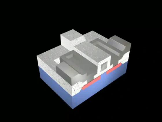 The circuit symbol for an MOS transistor is shown with its wires leading to the corresponding regions of structure.