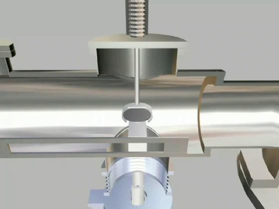 The FIB is designed to write a pattern with features as small as 300 atoms across. However, the pumps on the main MBE system cause it to vibrate over much larger distances. The FIB is therefore anchored on massive steel legs to the basement floor. It is then connected to the MBE system only via thin bellows (the zig-zag tube). Thus, the parts tinted blue, should be largely free of vibration.