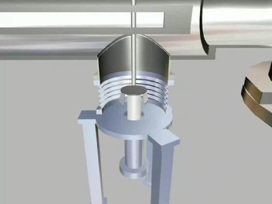 To see the FIB in action, let's use virtual reality to "fade away" the front wafer support. The FIB emits a finely focused beam of Ga ions that are scanned in a TV-like pattern across the center of the wafer. Where the Ga beam strikes the wafer surface, it will knock an occasional crystal atom out of place. We hope these disturbances will create sites where the MBE atoms will preferentially collect, producing layer growth only where we want it.
