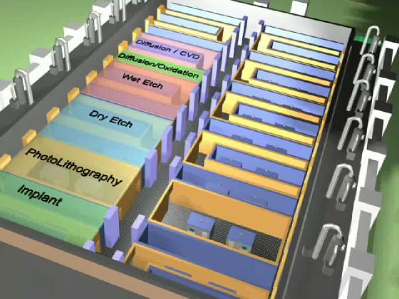 The final bays contain equipment for depositing metals and CMP (chemi mechanical polishing). These are used in the new "damascene" metallization process: