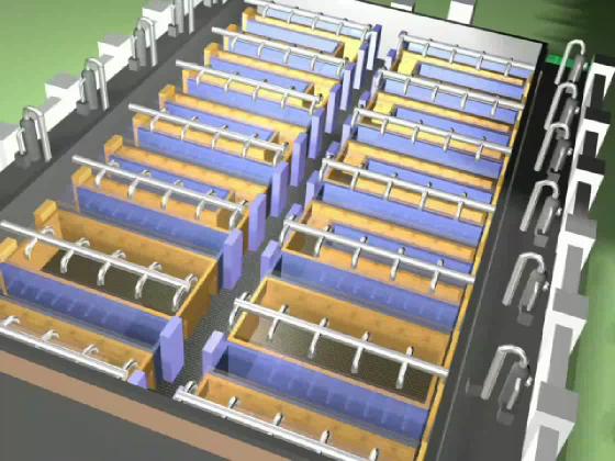 The blue ducts function like shower heads as they squirt filtered air through holes into the rooms immediately below. Filters in these ducts remove most dust particles yielding "class 100" air. This means that the air contains less than 100 particles per cubic meter larger than 1 micron in size.