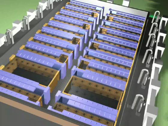 Below the air ducts and filters are the rooms (or "bays") in which chip manufacture occurs. This building is actually divided into two different manufacturing lines, one on the left of the building, one on the right. Each manufactures a different memory chip.