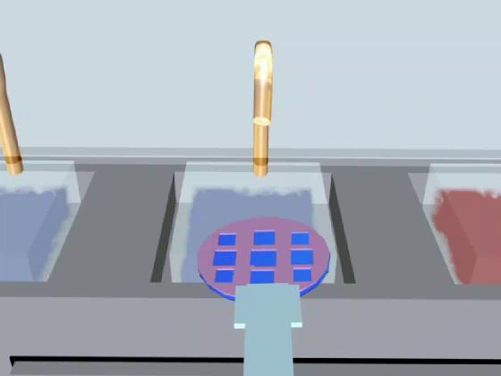 In the wet etch bench, the wafer is held using a specially fashioned wand made of a chemically resistant plastic. The wand fits into a slot in the transparent cover of the baths. It is designed so that the wafer must pass through all four baths before being removed from the bench.