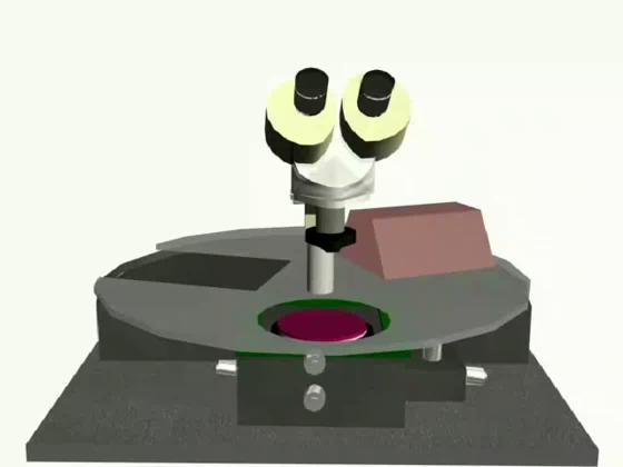 After alignment, the turntable is rotated to bring the exposure light source above the mask and wafer combination.
