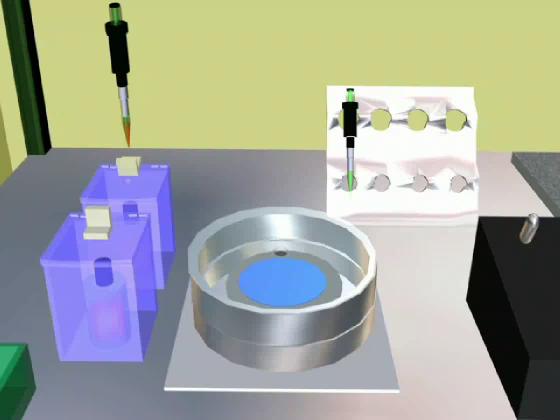 The photoresist is spun onto the wafer at 3000 RPM for 30 sec. The material datasheets provided by the manufacturer say that this should give a film thickness around 2 microns. The wafer is now ready for a pre-bake.