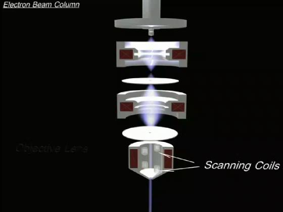 A voltage is then applied between the filament and the outer shell of the electron gun. The voltage creates an electric field that pulls electrons out of the finely pointed tip of the filament in a process known as "field emission."