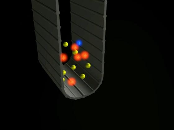 As electrons are steadily removed from the bottom pulley, it becomes more and more positive (as indicated by its red glow).