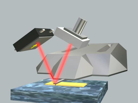 But now the electronic feedback loops kick in. By further energizing the top electromagnet, they rotate the invisible tripod (laser, cantilever and photodetector) upward. This continues until the cantilever straightens out enough to return the reflected laser to the center of the photodetector.