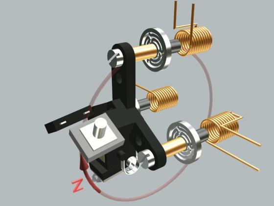As the right and top legs are pulled toward the magnets, the tripod rotates around the twisting spring at the base of the left leg.