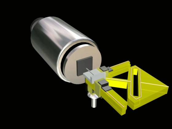 The X piezo (at the right) cycles on and off to move the tip side-to-side. This creates an X scan line across the sample and the screen.